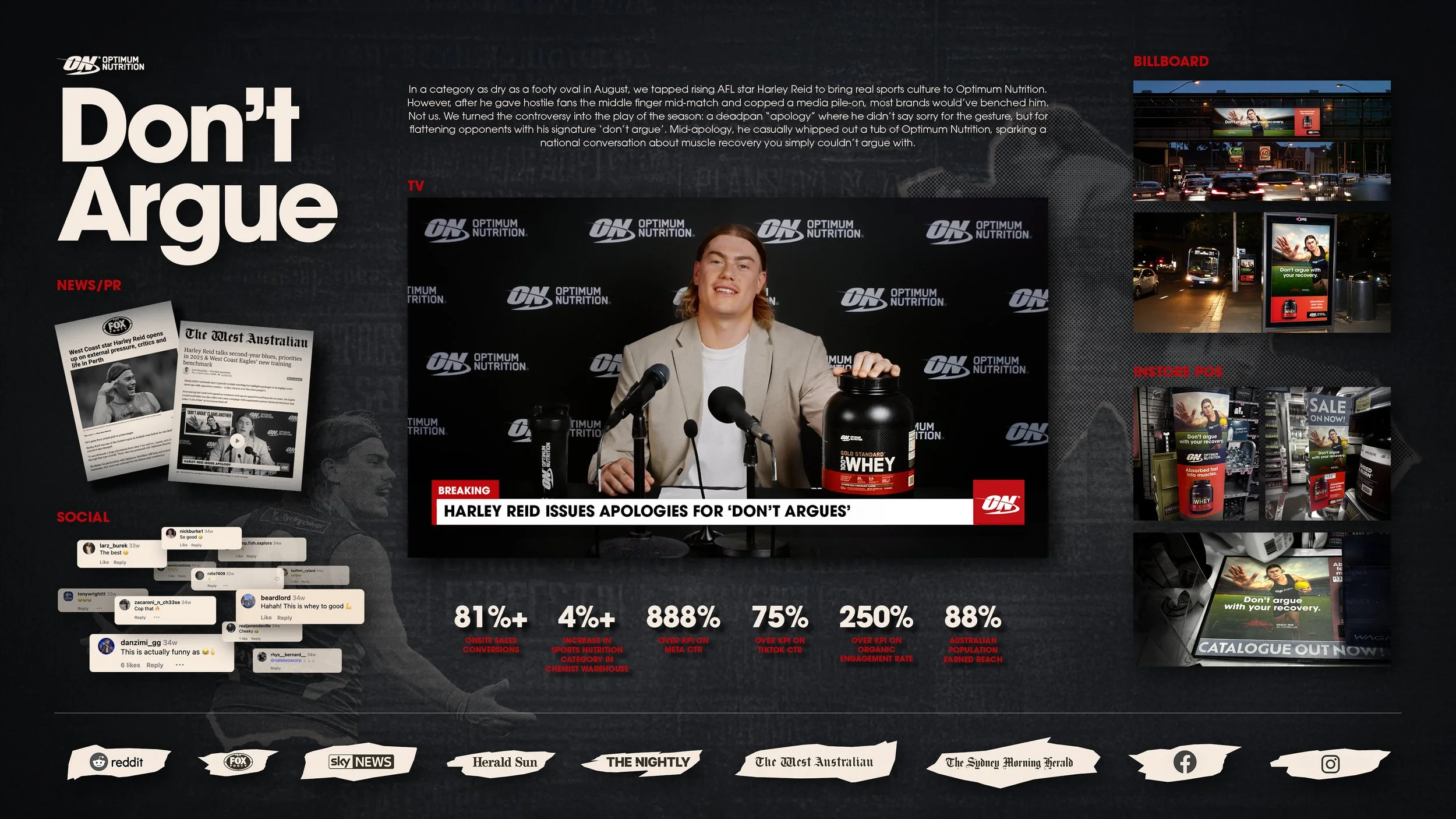 However, after he gave hostile fans the middle finger mid-match and copped a media pile-on, most brands would've benched him. Not us. We turned the controversy into the play of the season: a deadpan "apology" where he didn't say sorry for the gesture, but for flattening opponents with his signature don't argue' move. Mid-apology, he casually whipped out a tub of Optimum Nutrition, sparking a national conversation about muscle recovery you simply couldn't argue with.